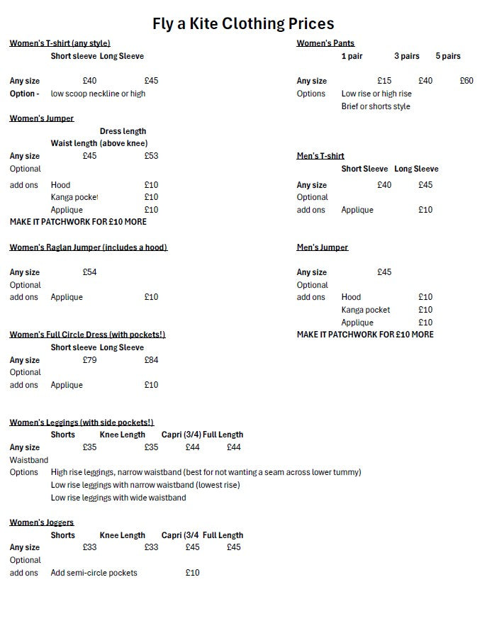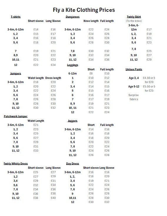 I've got a gorgeous selection of fabrics ready to be transformed into stunning clothing for kids and adults! For now, please get in touch to see what I have :-)