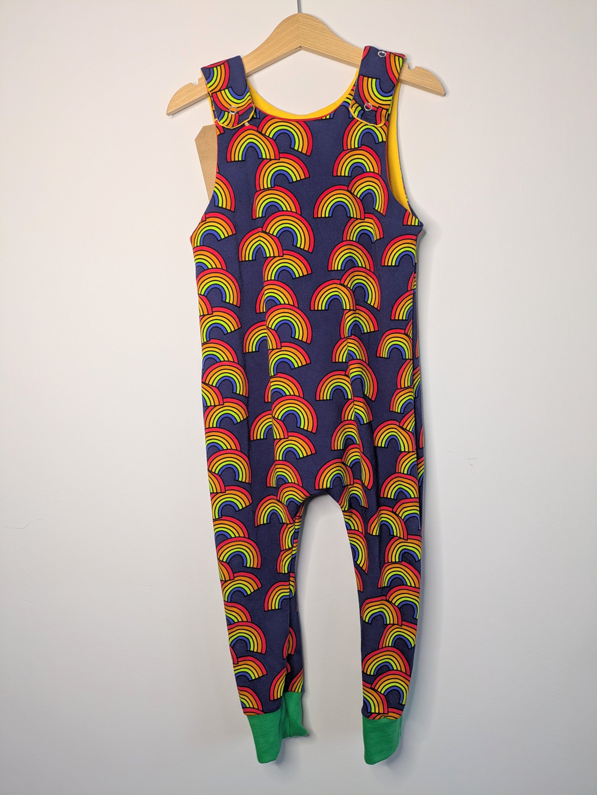 Bright unisex dungarees that grow with your little one! (blue cuffs age 2, green cuffs age 3)
